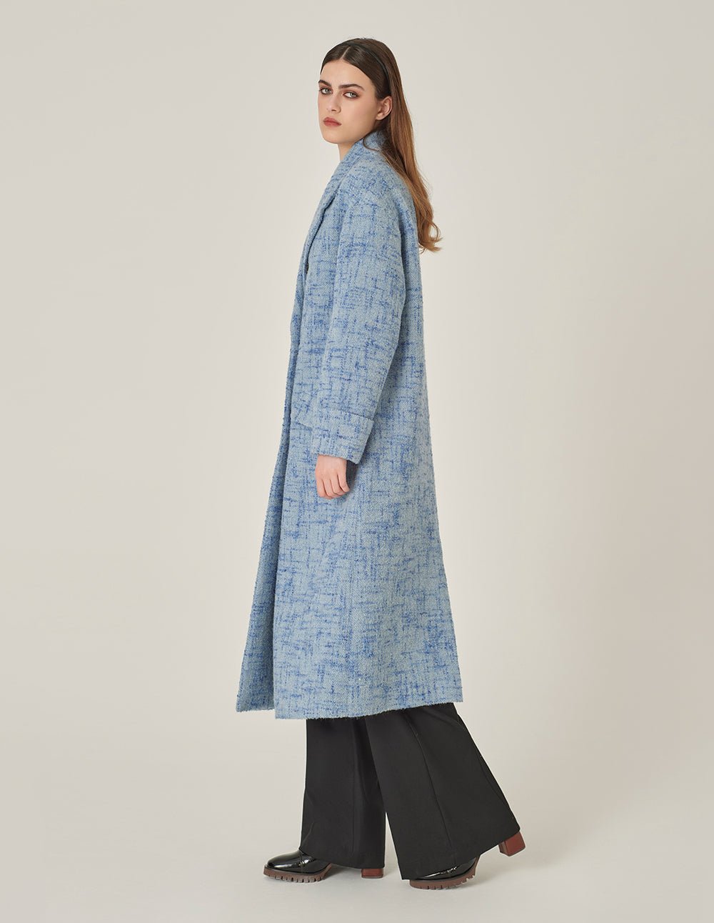 MARYLING’s coat is an interpretation of classic tweed. Its smooth and neat tailoring creates a slightly loose fit. It is paired with a gentle and intellectual mist blue tone to brighten up the autumn and winter fashion styles.