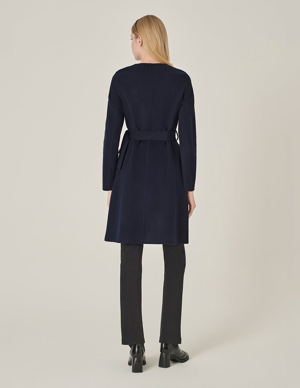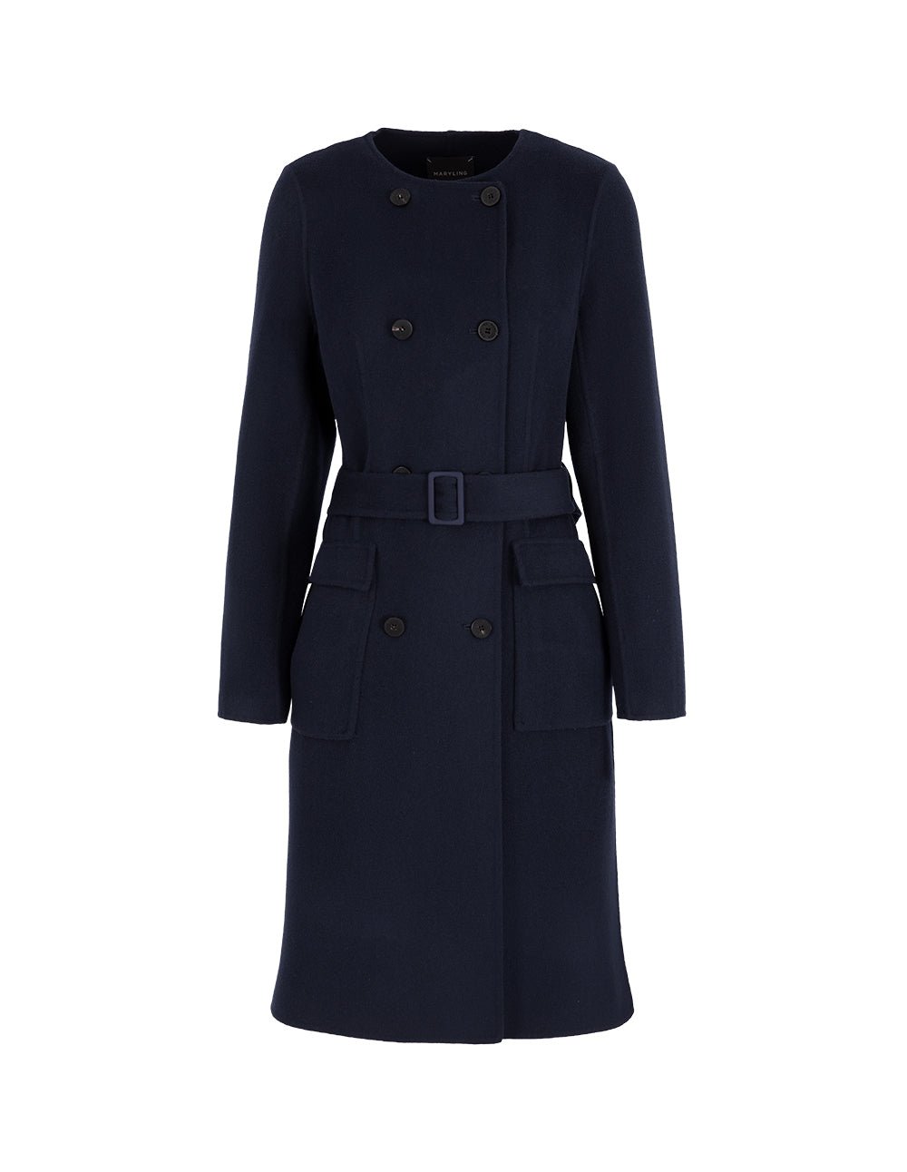 MARYLING’s collarless double-breasted coat is made of lightweight double-sided wool. It has a streamlined tailoring design. which is simple yet elegant. It is paired with a fabric belt to highlight the waist and show a woman’s personal charm.