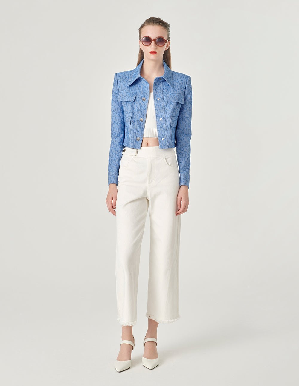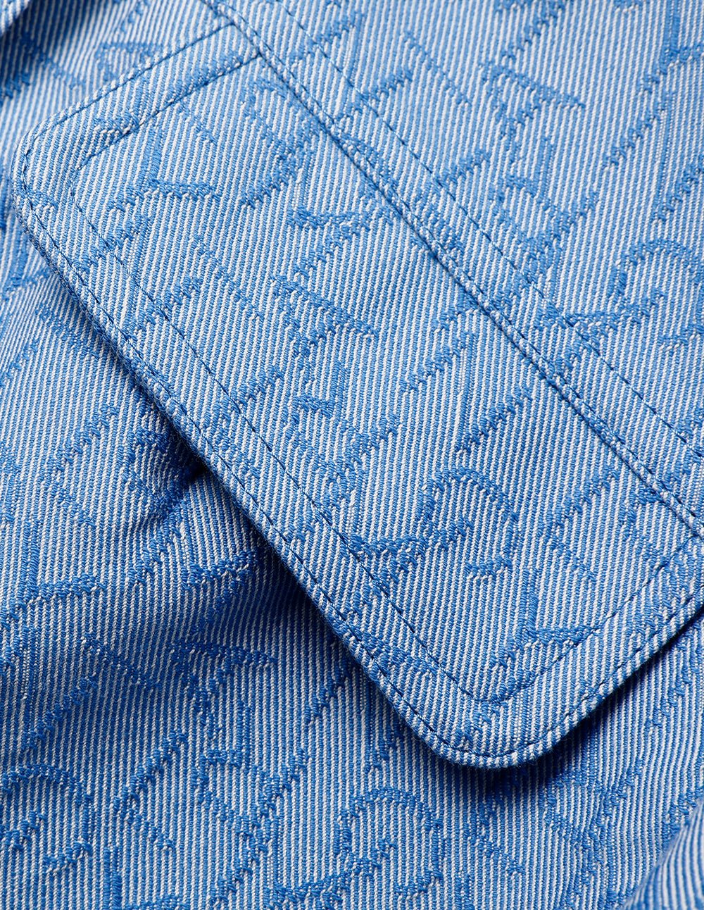 MARYLING’s LOGO jacquard jacket uses a neat tailoring design to create a neat and capable short version. The all-over logo is integrated into the dark and light blue denim jacquard effect. adding to its retro texture.