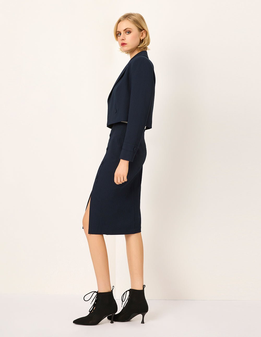 MARYLING’s jacket adopts a classic notch lapel collar. which fits the curve of the neck and shows a sophisticated temperament. It has an asymmetrical windproof flap. which has its own elegant style. The short cut is a boon for small people to make them look taller and a tool for optimizing the proportions of tall people. Paired with any bottoms. your body proportions will be perfect.