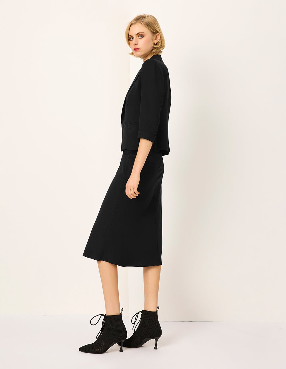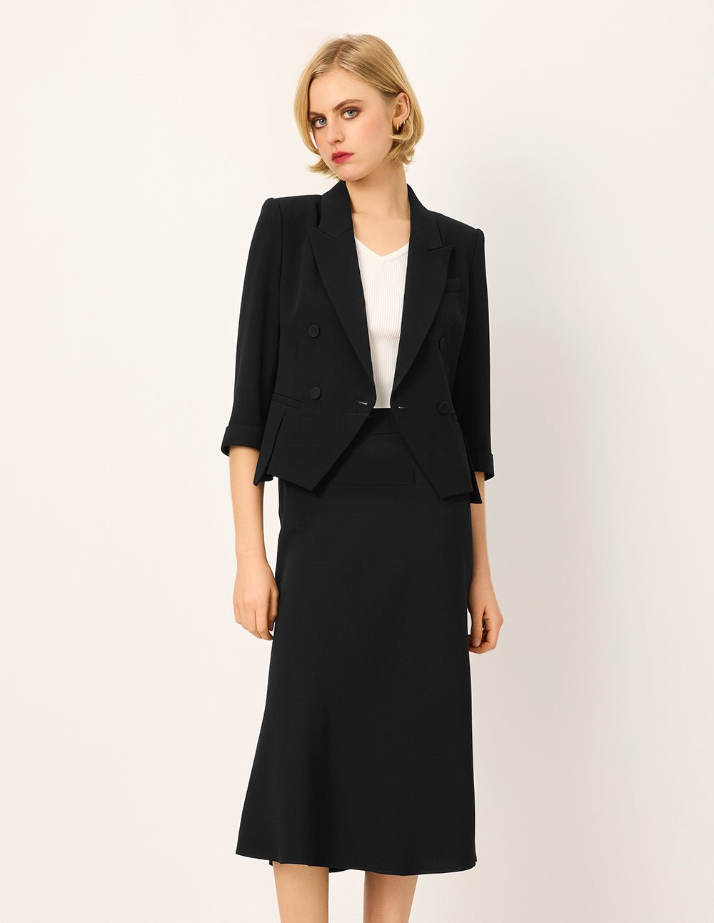 MARYLING’s suit jacket has a flat lapel neckline and a short length. which can easily modify the proportions of the figure and create a refreshing appearance. It is suitable for wearing on a variety of occasions. Paired with the skirt of the same series. it shows an elegant and high-minded temperament.
