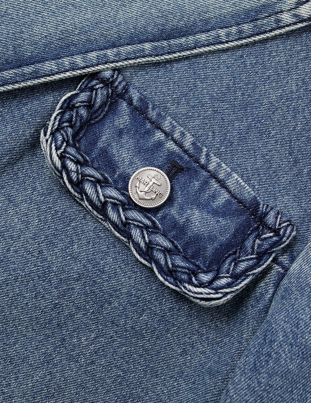 The large lapel with sharp lines sets the aura of a heroine. the seam edges are like brushstrokes to outline the contours. the symmetrical flap pockets on the chest and hem are layered. and the geometric language of different sizes is beautiful. The rounded hem easily softens the edges of the denim. adding a touch of Italian romance.