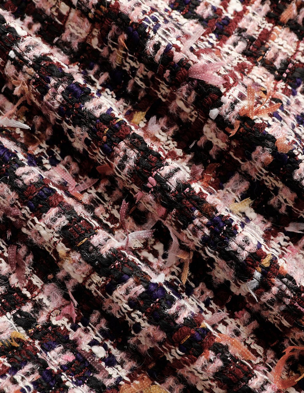 MARYLING’s double-breasted short jacket is made of tweed fabric. with a streamlined H-shaped silhouette and black crepe details. giving it a unique texture. showing a retro and fashionable style. and a playful and age-reducing atmosphere.