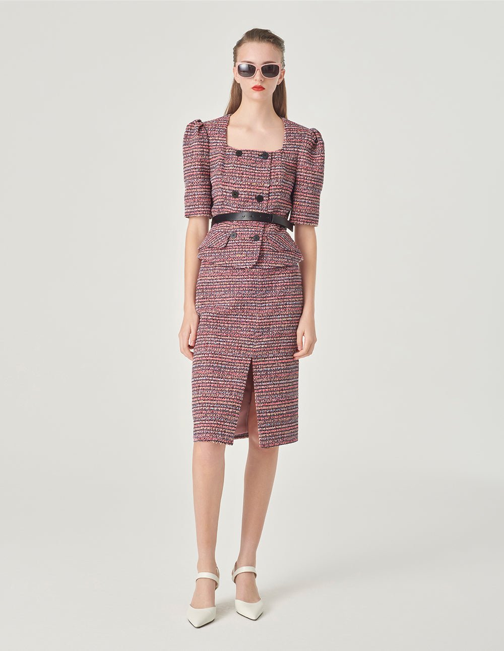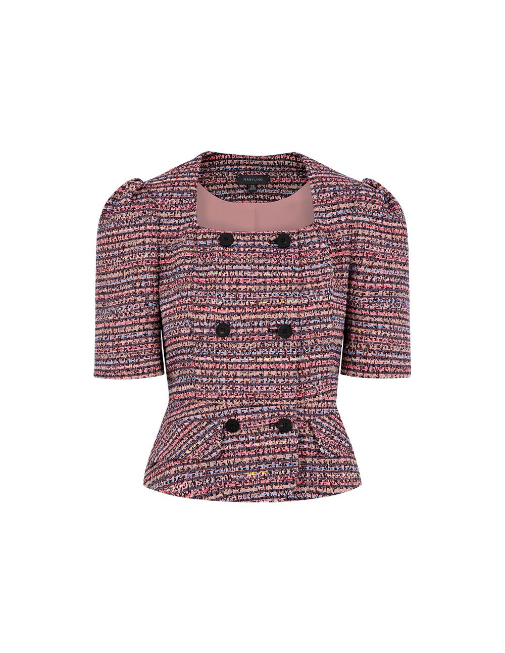 MARYLING’s jacket shows elegance with its short three-dimensional silhouette. The square collar and ruffled hem give it a retro look. It can be paired with the skirts of the same series. showing an elegant and dignified new feminine style.