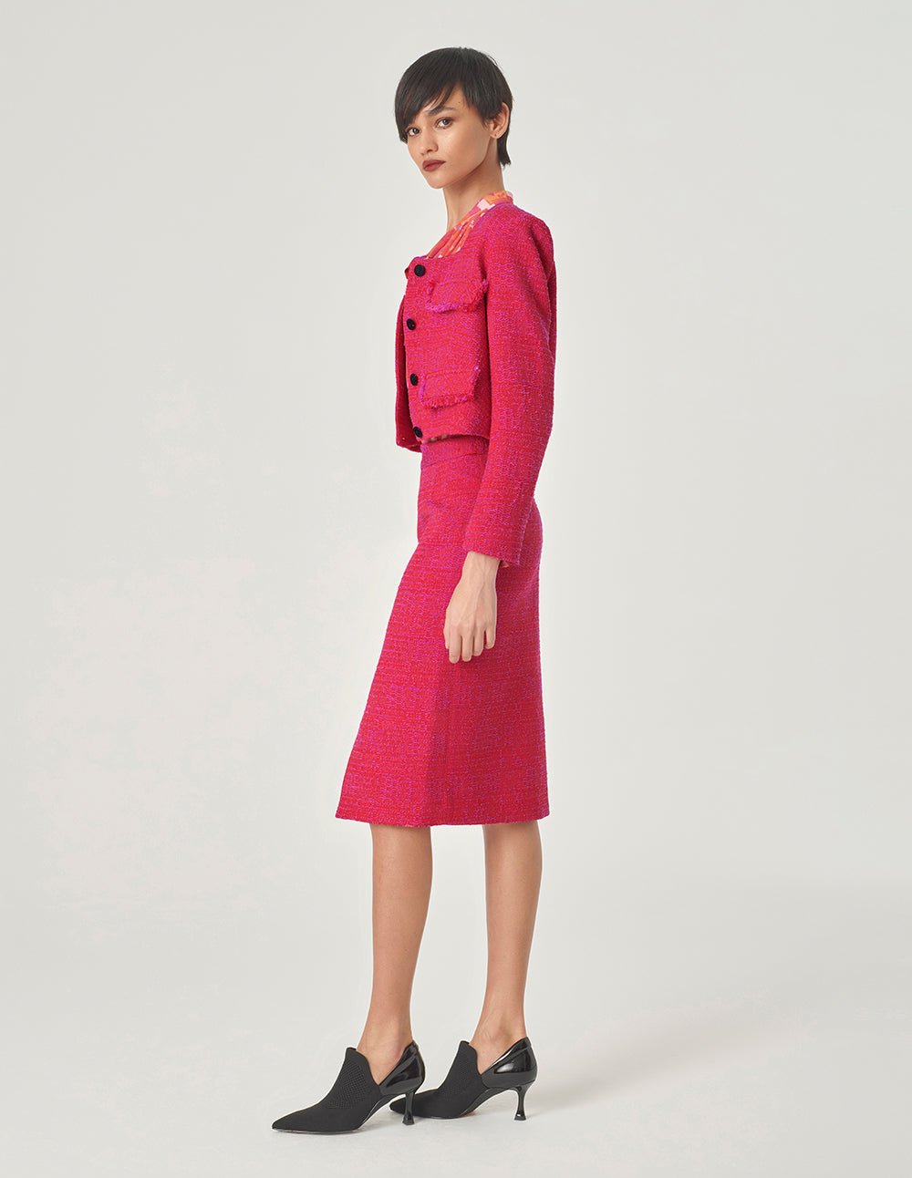 MARYLING’s jacket continues the French luxury style with its smooth silhouette and fine tailoring techniques. The short square-necked jacket and pockets are decorated with tassel details. highlighting youthful fashion and delicate feminine charm. It can be paired with a coordinating skirt.