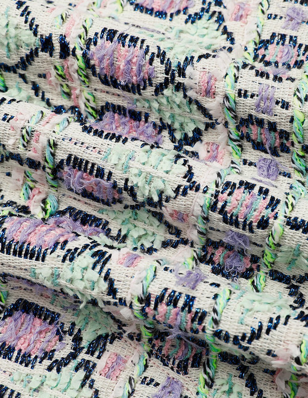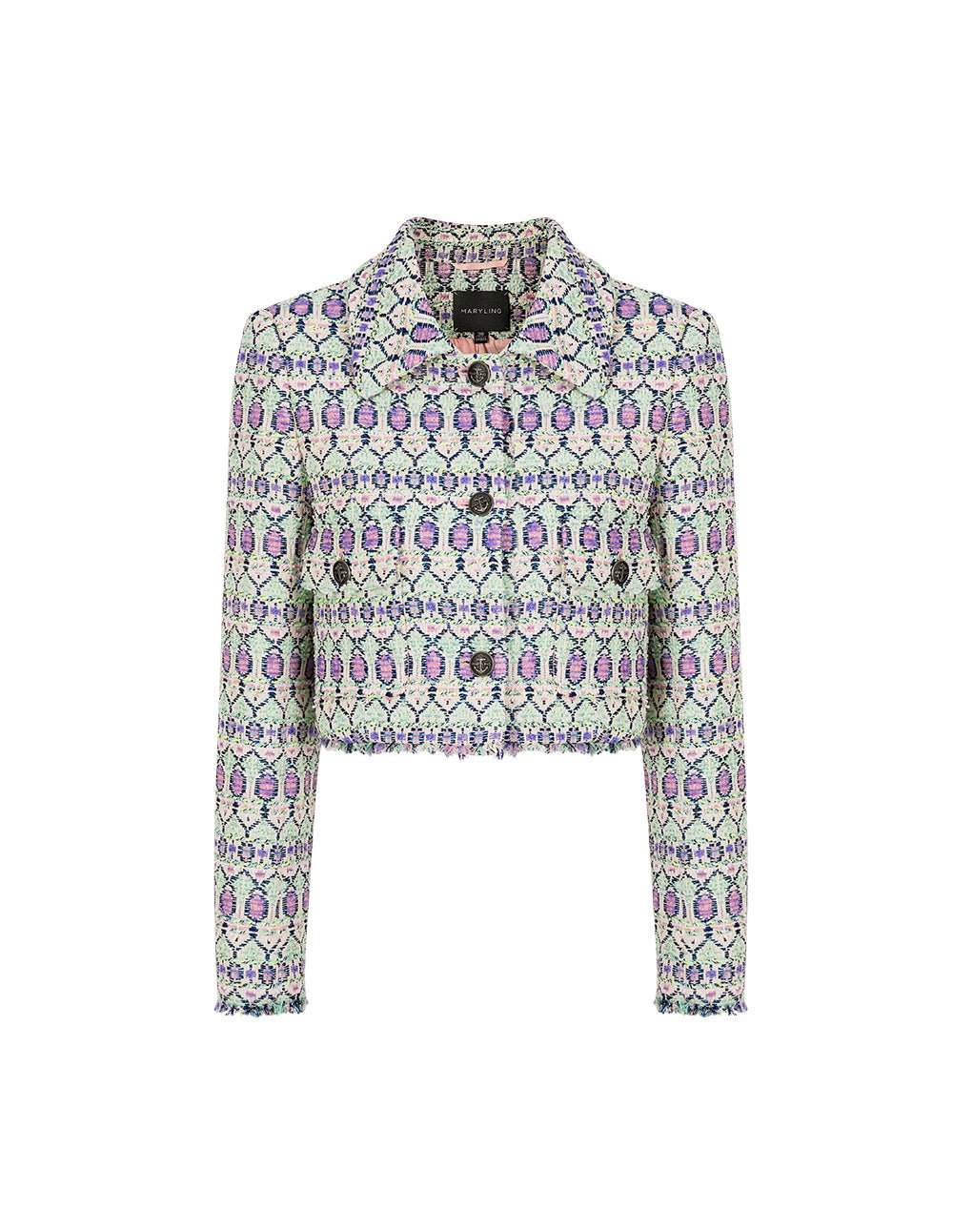 MARYLING’s jacket is made from finely textured tweed. Sweet pinks. greens. and various colors interweave to form delicate patterns. The smooth and neat tailoring creates a short. fitted silhouette that adds to the overall look. It has a retro flavor but also has an elegant and refined style.