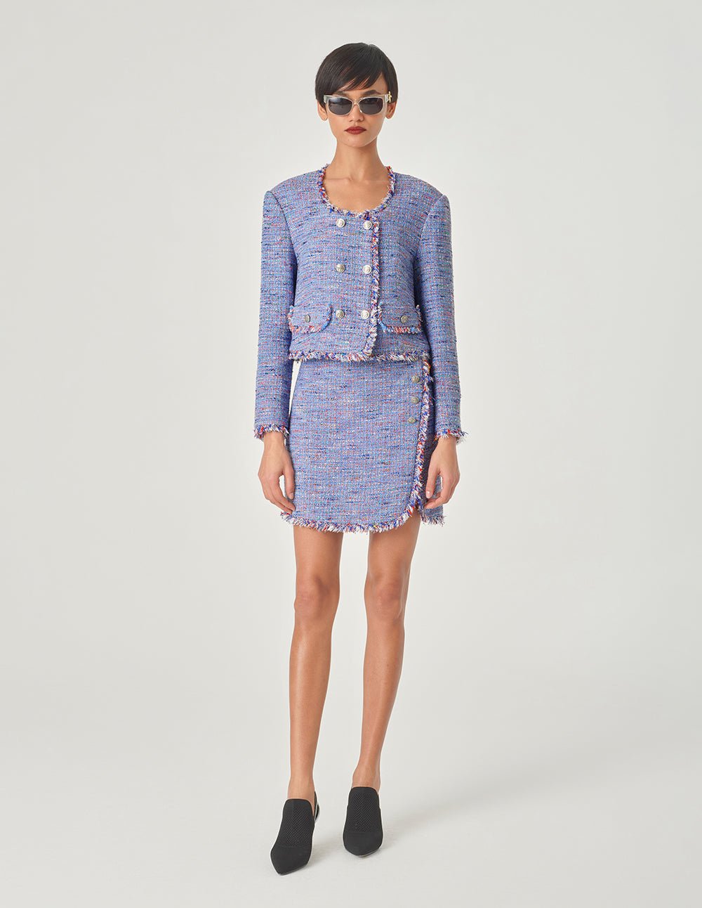 MARYLING’s jacket is made of tweed fabric with fine texture. It uses denim blue and light pink as the overall tone. It is blended with colorful yarns to make the fabric more refined and noble. The metal buttons collide with simple lines. Youthful sophistication.