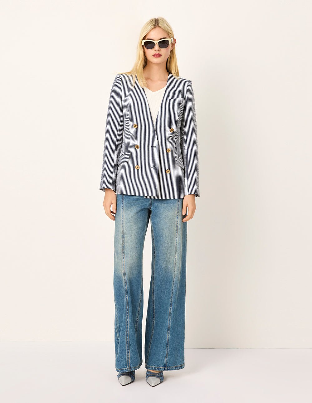 MARYLING’s suit jacket adopts classic nautical style blue and white stripes. which brings a refreshing and free atmosphere. The pinstripes add a sense of slenderness and sophistication. Under the collar. the gold-copper LOGO double-breasted buttons shine with luster. bringing together confidence and strength. The iconic diamond cut is like an invisible sculptor. artfully outlining the silhouette that combines elegance and strength.
