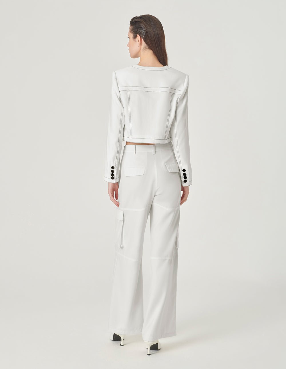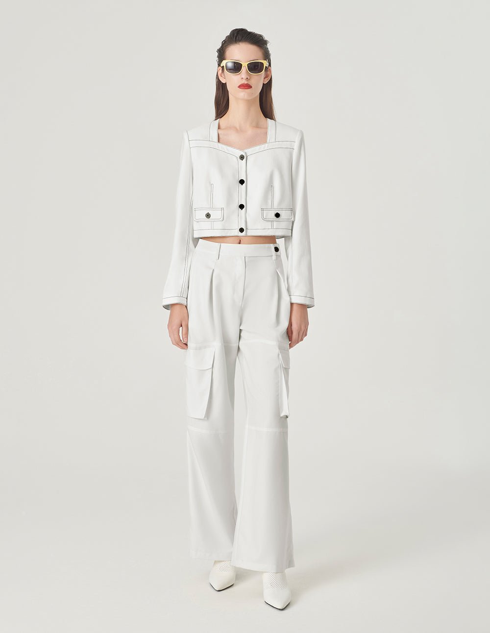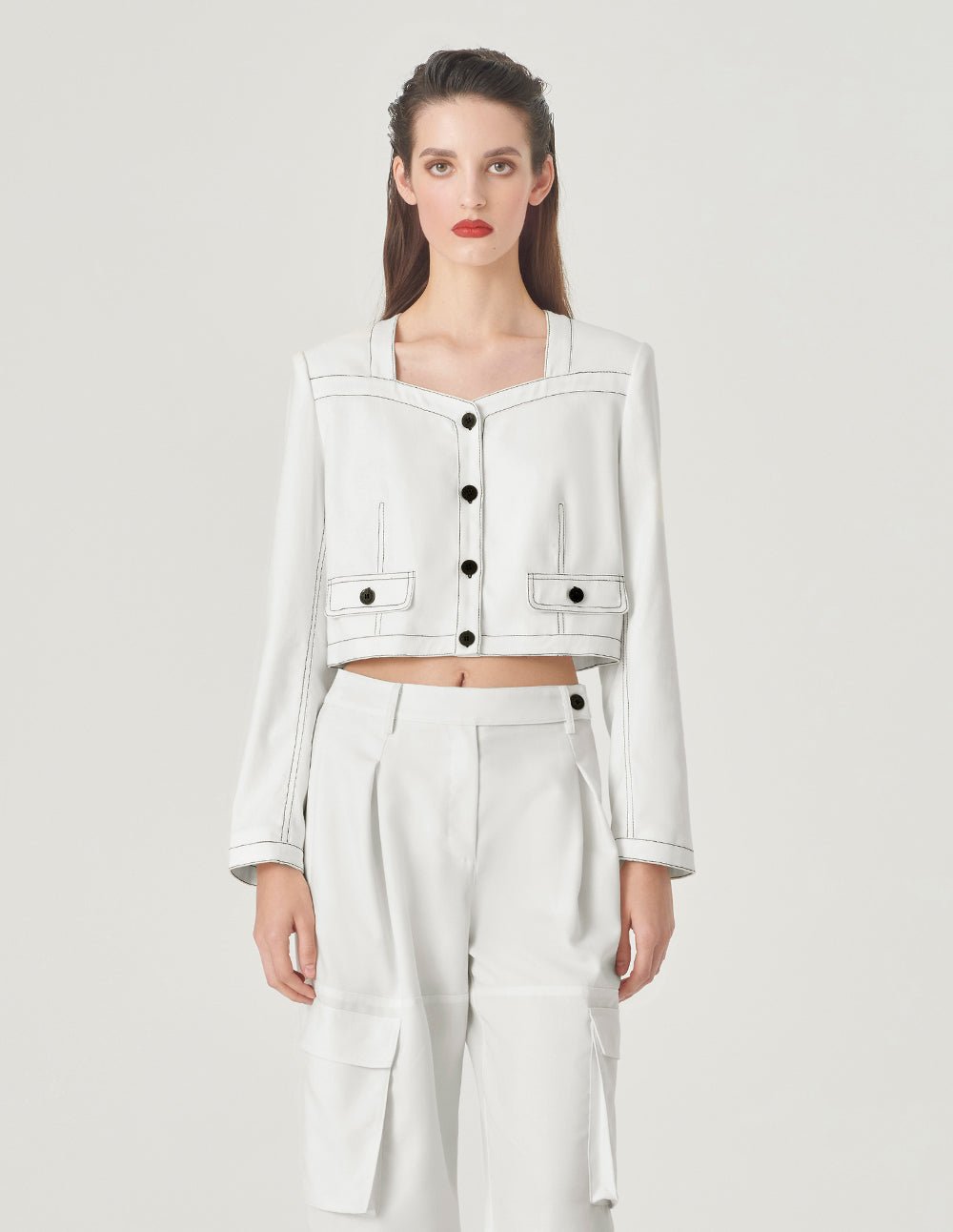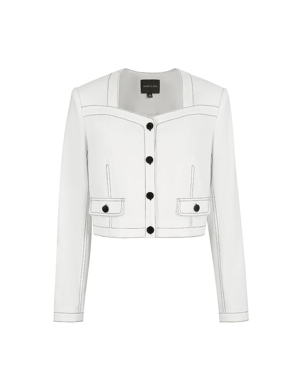 MARYLING’s short jacket has a clean silhouette created by sharp tailoring. It uses a unique square collar and black double topstitch design details. It is simple and slightly retro. It is a youthful and fashionable coordinating piece.